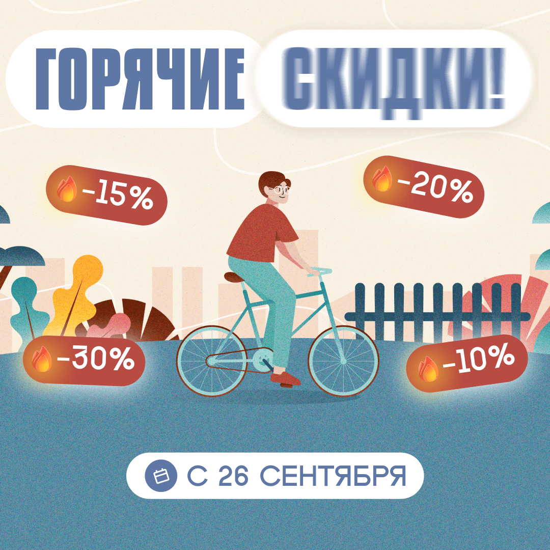 С 26 сентября стартует масштабная распродажа велосипедов, самокатов и запчастей! Успейте получить максимальную выгоду — скидки будут только снижаться!